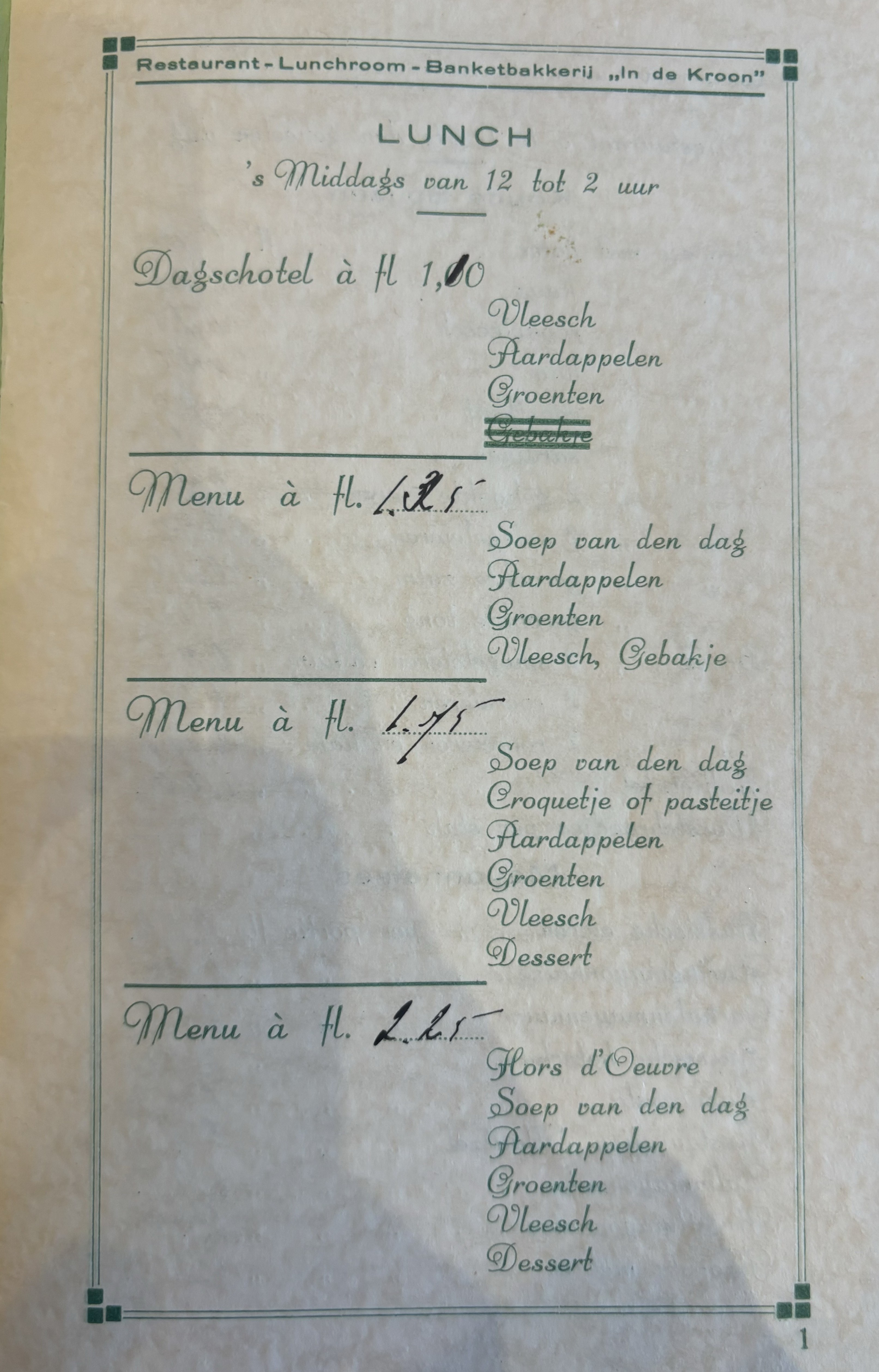 In zijn beginjaren werkte Franks opa in Brussel, waar hij onder andere kroketten leerde maken. De kalfskroket die daardoor in 1925 op de menukaart verscheen, staat er een eeuw later nog altijd op. “Onze kroket en ons pasteitje met dezelfde kalfsragout lopen als een rode draad door onze lunchroom. In de winkel geldt dat voor onze Limburgse vlaai en onze Christoffeltaart”, aldus Frank. Wat in de loop der tijd wel is veranderd, zijn de prijzen. “Ik heb een menukaart uit 1925 en toen kostte een kopje koffie vier cent.”