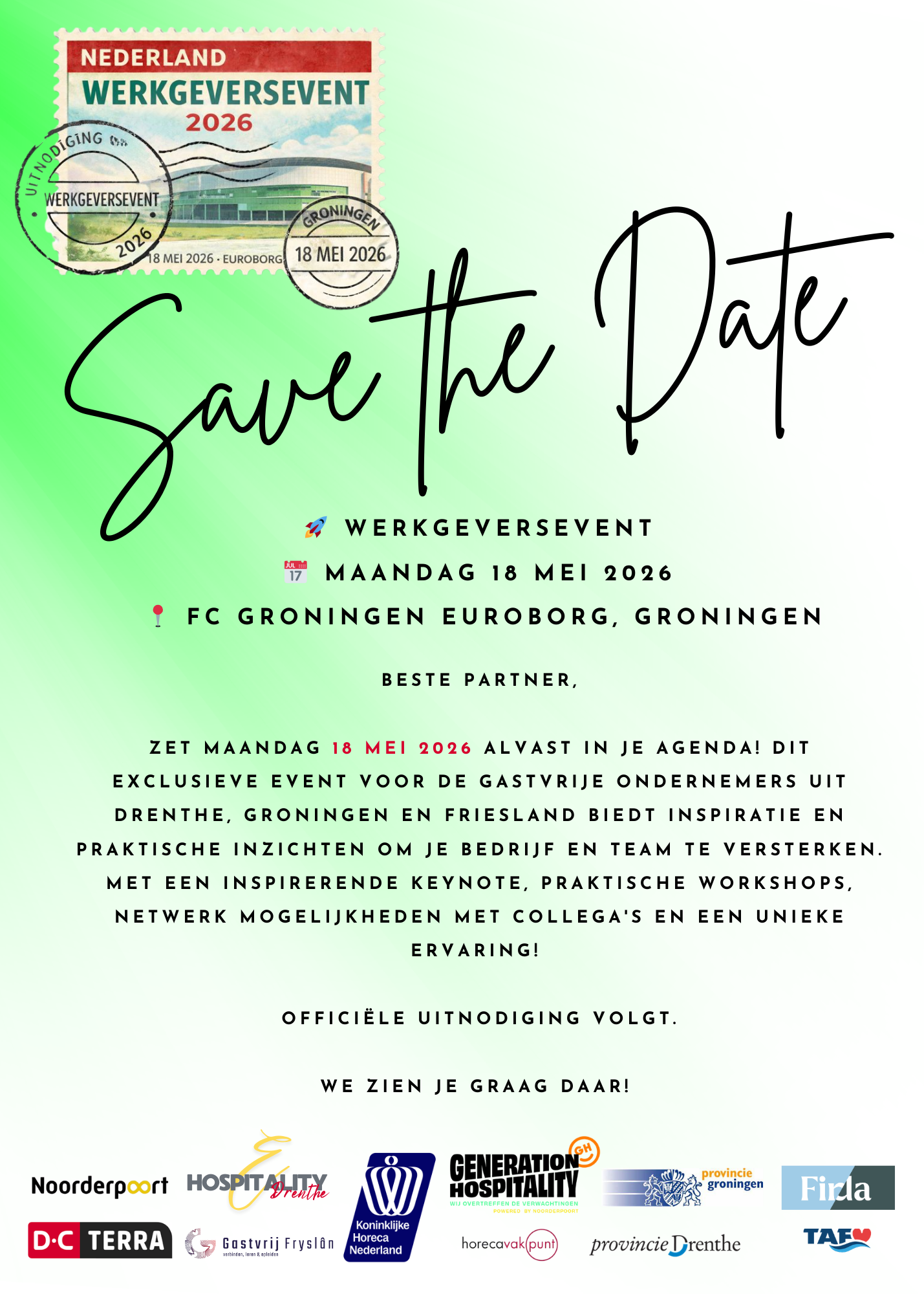 Het event wordt georganiseerd door Generation Hospitality, in samenwerking met Gastvrij Fryslân en Hospitality Drenthe. De bijeenkomst vindt plaats op maandagochtend 18 mei bij FC Groningen in de Euroborg.