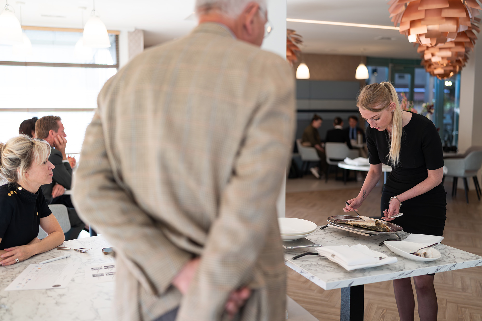 De praktijkdag startte met een klassieke proef: het fileren van een zeebaars aan tafel. “Ik was ontzettend zenuwachtig, maar eigenlijk ging het best goed,” vertelt Sanne. Bij deze opdracht draaide alles om precisie en etiquette. De afgelopen periode oefende ze intensief: “Zoveel dat ik voorlopig even geen zeebaars zelf hoef te eten.” Haar plezier in het combineren van klassieke tafeltechnieken met moderne etiquette, was goed terug te zien in haar uitvoering.